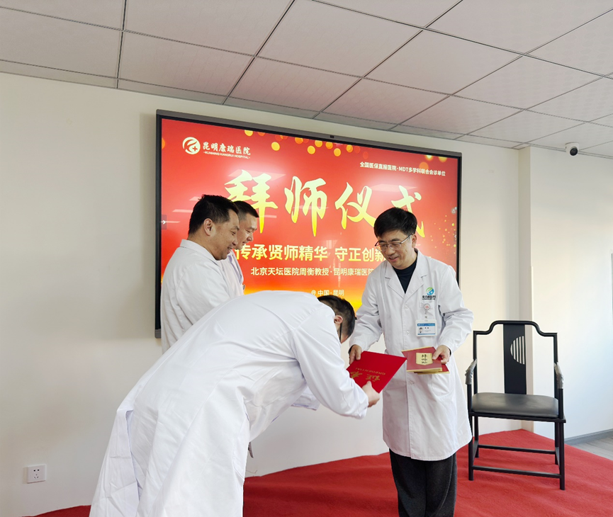 传承贤师精华,守正创新为民,为了落实优质医疗资源下沉工作要求,促进医院神经内科医疗人才队伍建设,进一步提升昆明康瑞医院的综合医疗水平和服务能力,2024年12月8日,昆明康瑞医院2024首届师徒承拜仪式隆重举行,来自北京天坛医院的周衡教授与我院的何栋源,宋军,屈宁波等3名医师结成师徒关系,共同开启了医学传承的新篇章。医院领导班子成员、全体中层干部、部分职工代表、结对师徒共同见证这一重要时刻。
